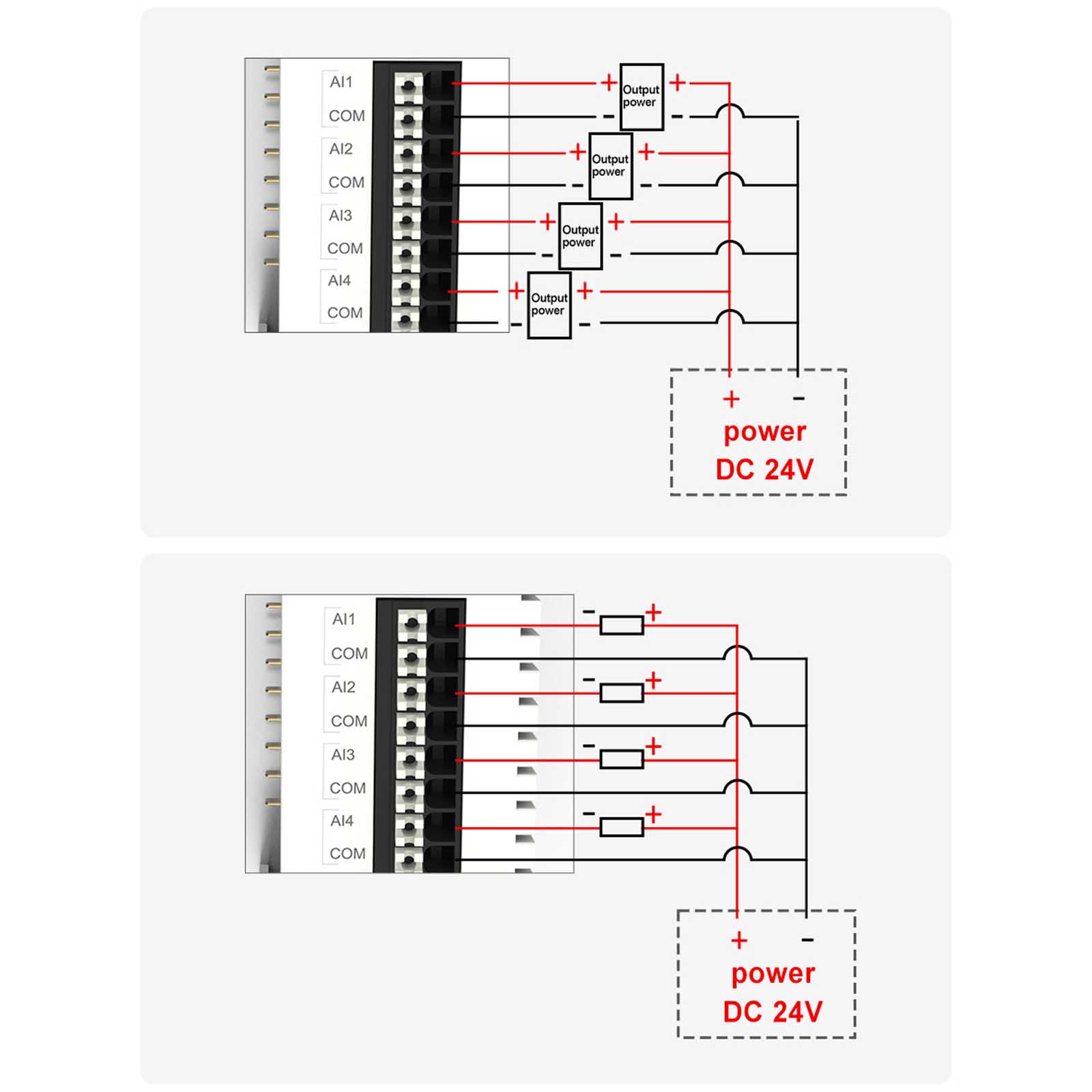 W przypadku czujników 2-przewodowych 4-20 mA sam czujnik ma tylko 2 zaciski okablowania, które służą zarówno jako kanały zasilania, jak i transmisji sygnału. W tym scenariuszu podłączenie zacisku AI do obwodu zasilania umożliwia wykrywanie sygnału analogowego.
