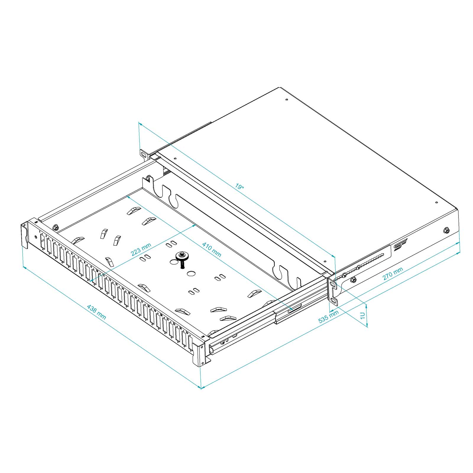 - Liczne przetłoczenia: Dzięki przetłoczeniom w dnie szuflady można łatwo przymocować światłowody za pomocą rzepów lub opasek zaciskowych, co zapewnia ład i porządek.