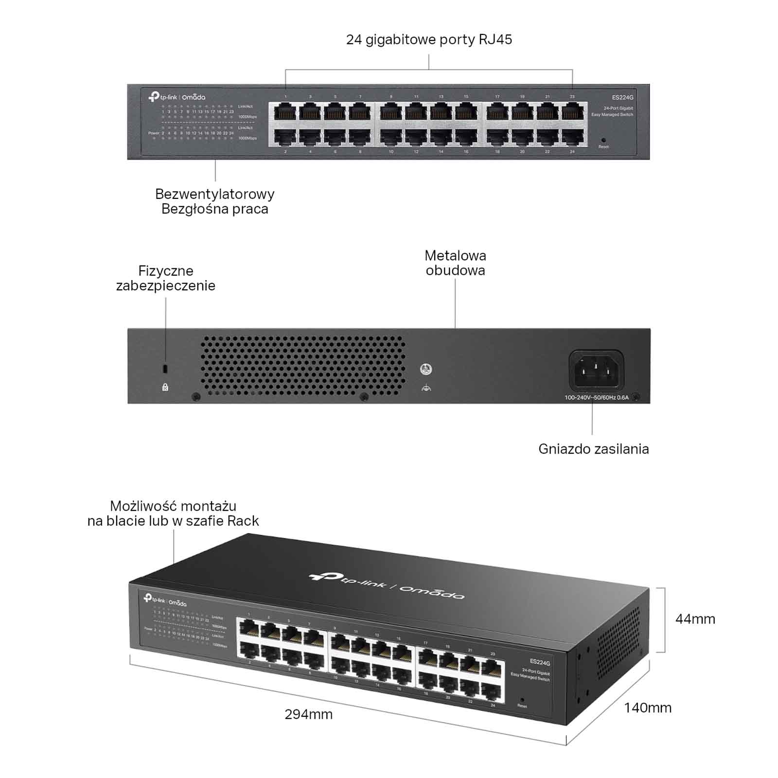 • 24 porty RJ45 10/100/1000 Mb/s • Automatyczna negocjacja / Automatyczny MDI/MDIX |