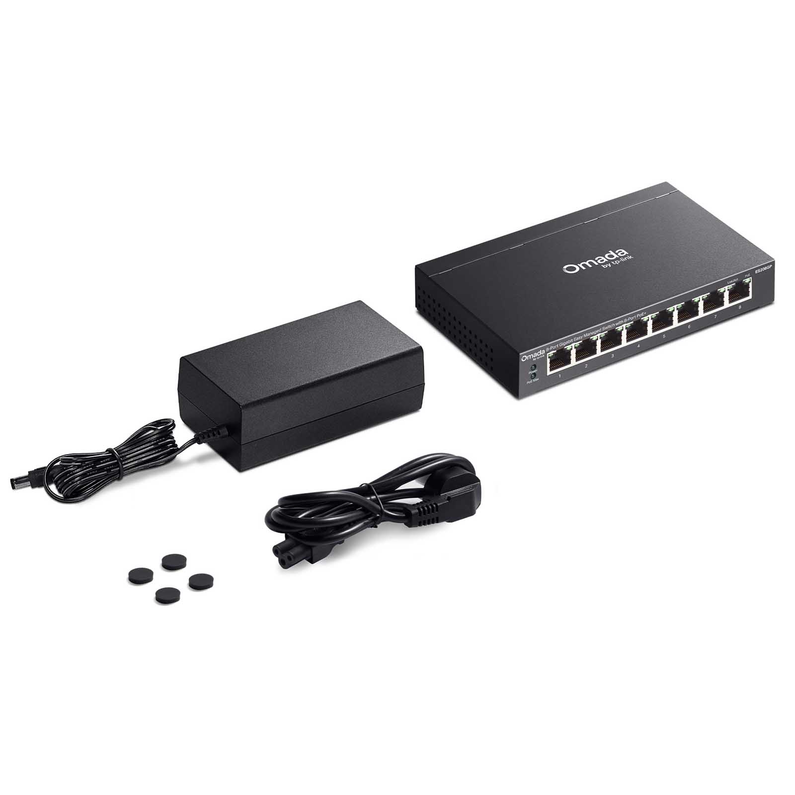 • ES208GP • Zasilacz • Kabel zasilający • Gumowe nóżki • Instrukcja instalacji |