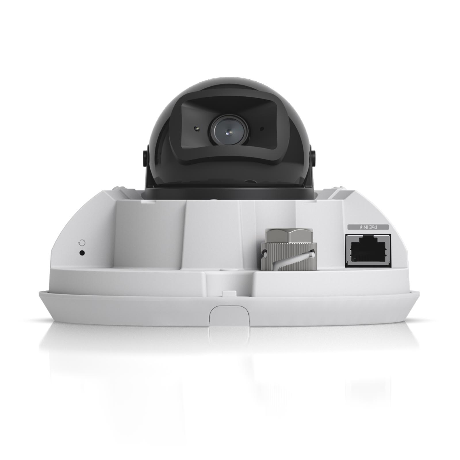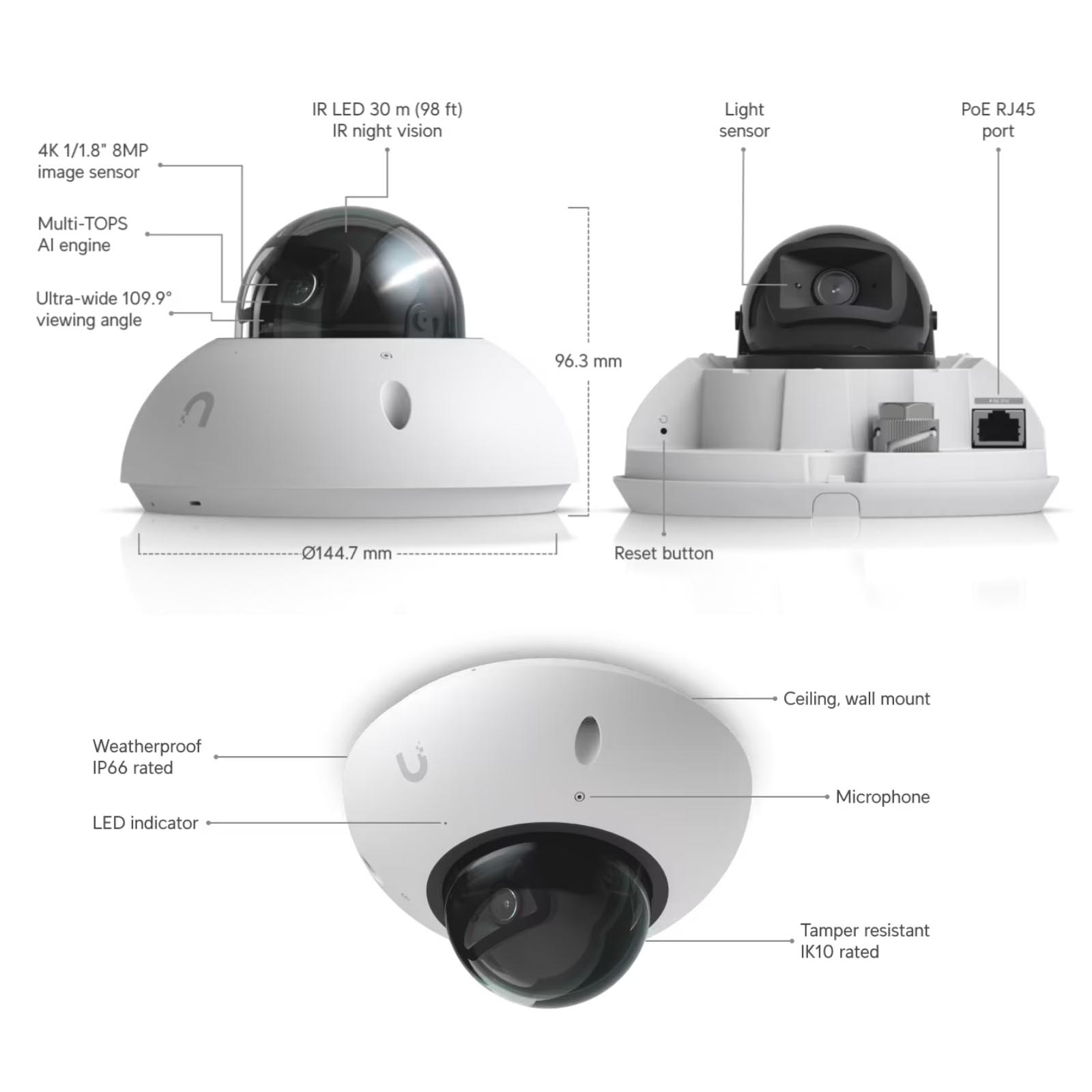 Ubiquiti UniFi Enterprise G6 Dome to urządzenie z serii Enterprise, przeznaczone do środowisk biznesowych. G6 Dome to zewnętrzna kamera typu DOME wyposażona w matrycę 8 MP (3840 x 2160 przy 30 klatkach na sekundę) o rozmiarze 1/1,8 cala oraz stały obiektyw o poziomej szerokości pola widzenia 109,9°. Wbudowany iluminator IR umożliwia kamerze rejestrowanie scen nocnych w odległości do 30 metrów. Kamera jest również wyposażona w mikrofon do nagrywania dźwięków otoczenia. Obsługuje również silnik Multi-TOPS AI, który w połączeniu z dalekosiężnym oświetleniem IR stwarza idealne warunki do dyskretnej instalacji w miejscach o dużym natężeniu ruchu.
