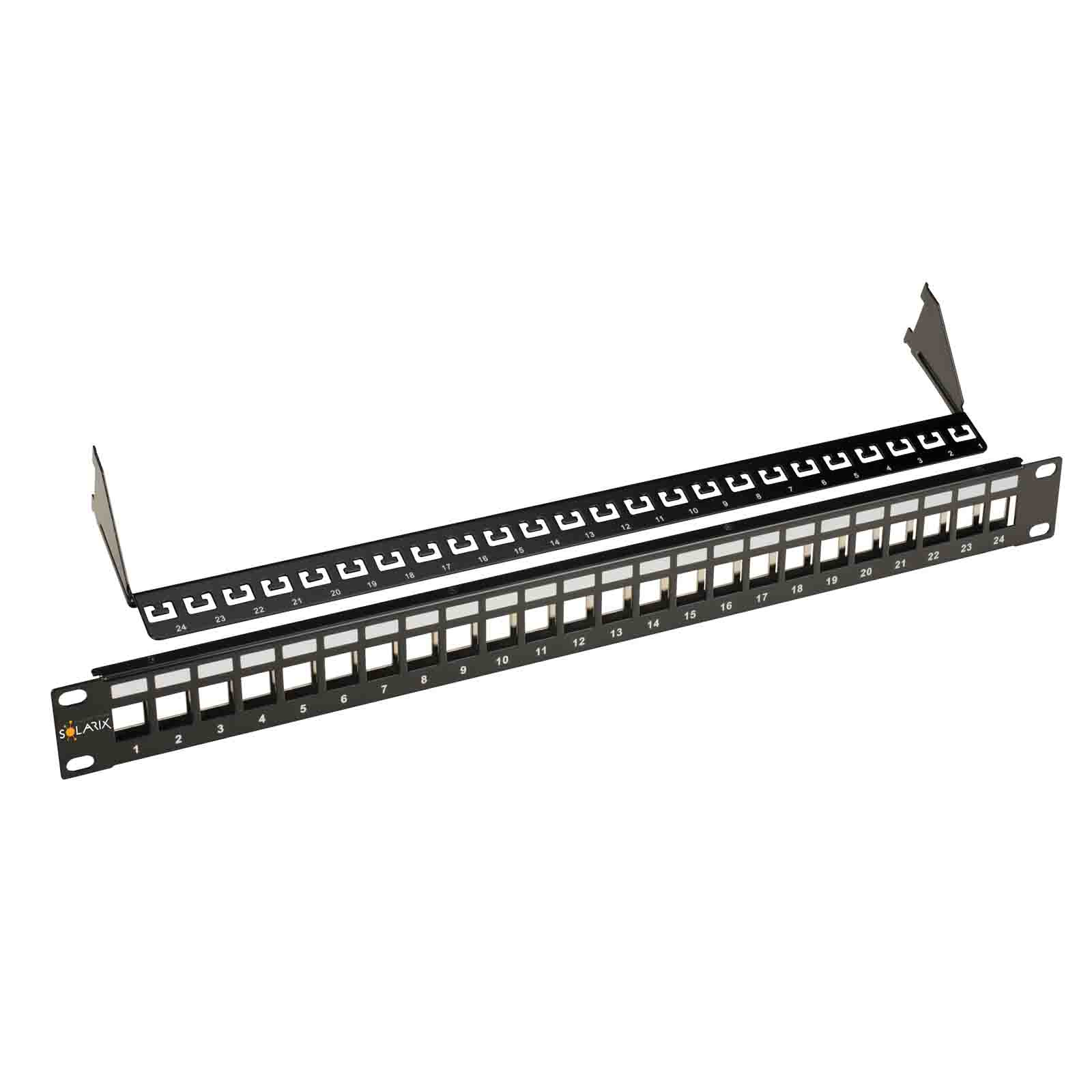 Modułowa konstrukcja patch panela pozwala na wygodną instalację, a dzięki opasce zaciskowej dołączonej do panela, również na łatwe odłączenie i solidne przymocowanie kabla danych bezpośrednio do korpusu panela. Ten patch panel jest wyposażony w przewód uziemiający, który umożliwia podłączenie go do uziemienia szafie rack. Kolor patch panela i opaski zaciskowej jest czarny, rozmiar w szafie teleinformatycznej to 1U. W razie potrzeby wolne porty panelu można zaślepić zaślepką SXKJ-0-BK. Wymiary otworów keystone w tym panelu modularnym Solarix wynoszą 19,5±0,1 mm x 14,8±0,1 mm (tj. zgodnie z normą EN 60603-7). Panel jest w całości metalowy.