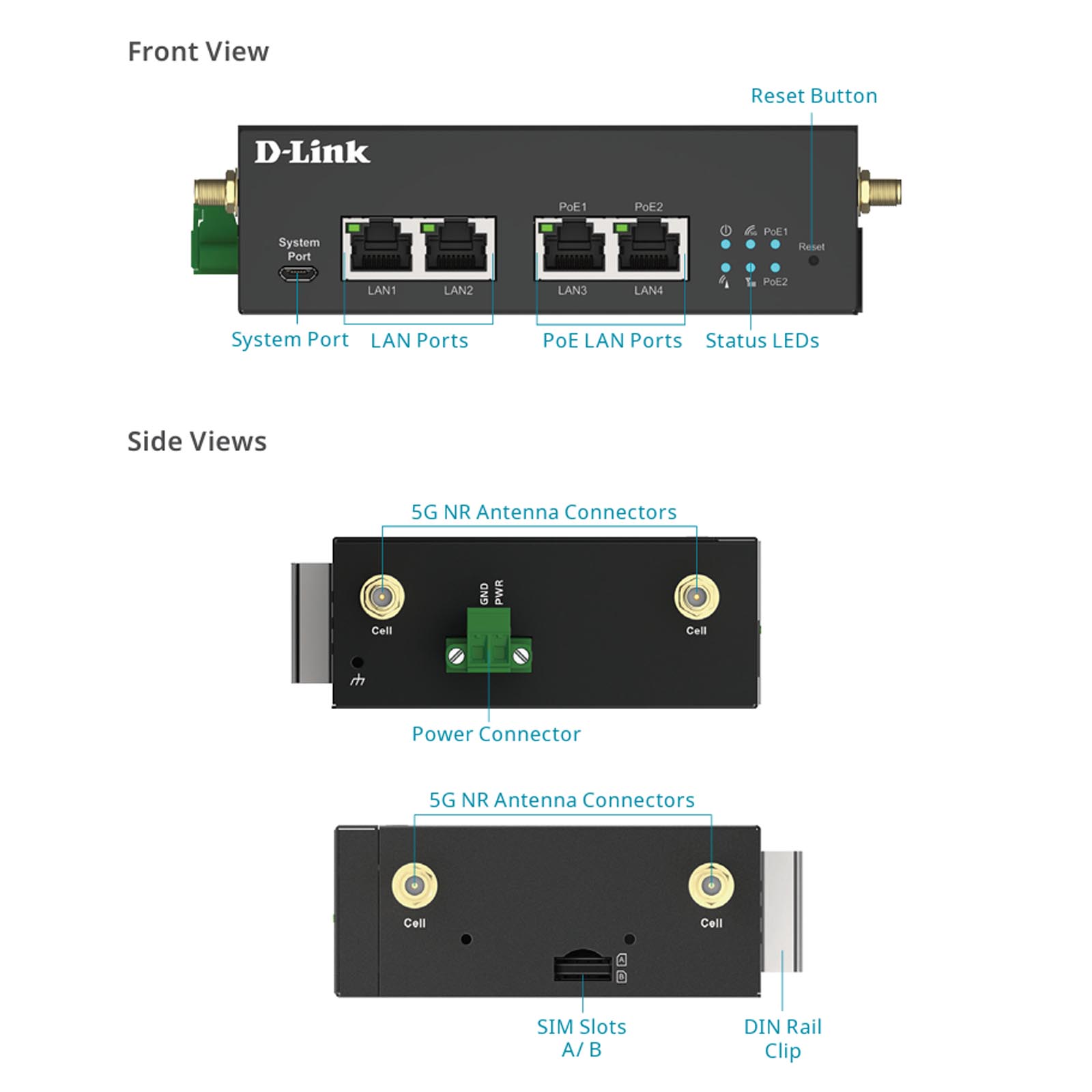 Modem DWM-314-GP 5G Multi-Connect PoE wykorzystuje moc technologii 5G, aby zapewnić ultraszybką transmisję danych i niskie opóźnienia, gwarantując niezawodne połączenie. Wyposażony w dwa sloty na karty SIM z funkcją przełączania awaryjnego (failover), zapewnia ciągłość działania nawet w przypadku awarii jednej sieci.
