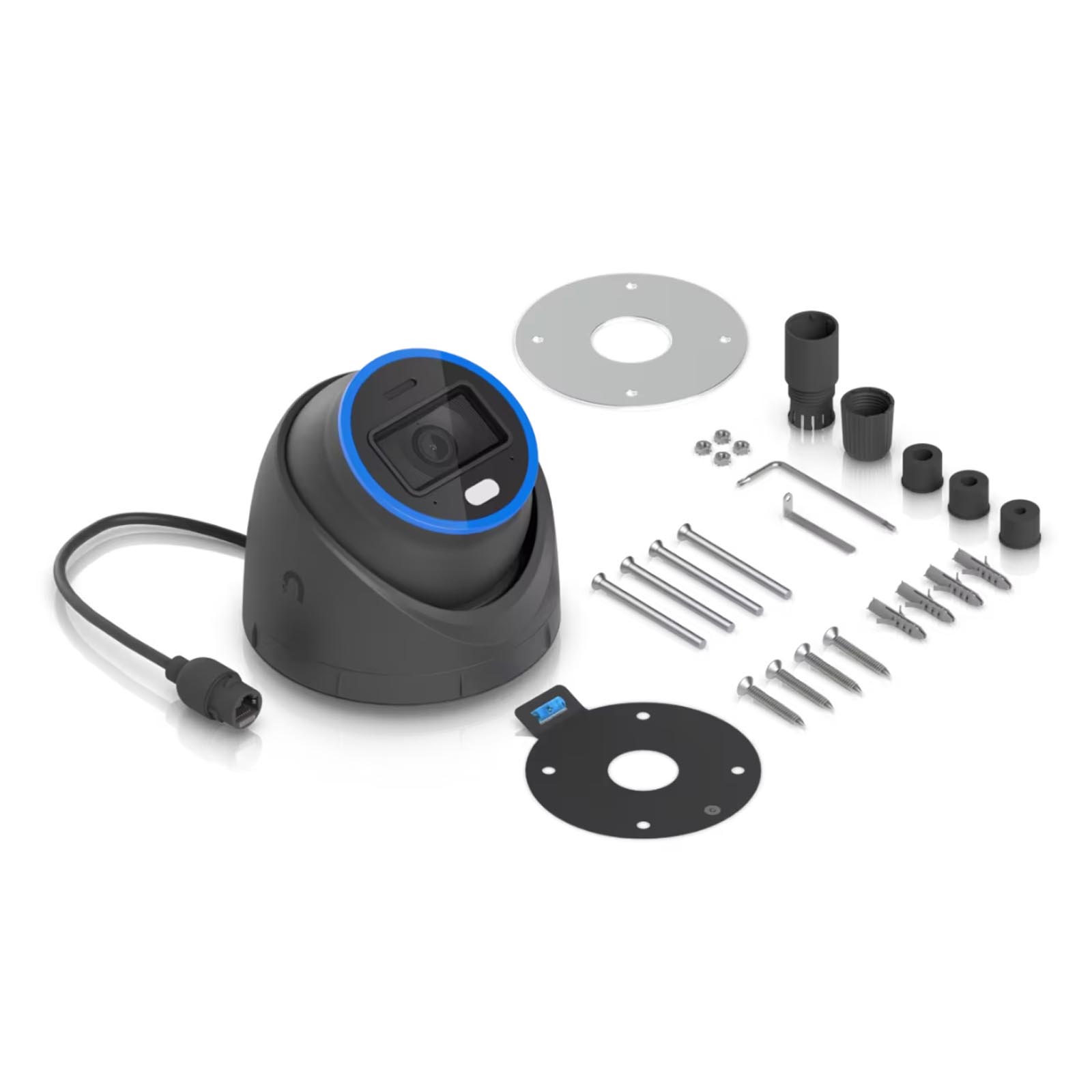 Ubiquiti AI Turret z rodziny UniFi Protect jest wyposażona w matrycę 8 MP (3840 x 2160 pikseli) przy 30 klatkach na sekundę, stały obiektyw około 2,8 mm (nieokreślony przez producenta, wywnioskowany na podstawie pola widzenia), oświetlenie podczerwone i białe światło do widzenia w nocy, mikrofon audio oraz głośnik do komunikacji dwukierunkowej z opcją wyciszenia. Kamera jest umieszczona w wytrzymałej obudowie z aluminium i poliwęglanu o odporności na wandalizm na poziomie IK08 i stopniu ochrony IP66 przed pyłem i strumieniami wody. Łączność sieciowa jest dostępna poprzez Gigabit LAN z obsługą PoE (42,5 do 57 V DC), zużywając maksymalnie 20 W.