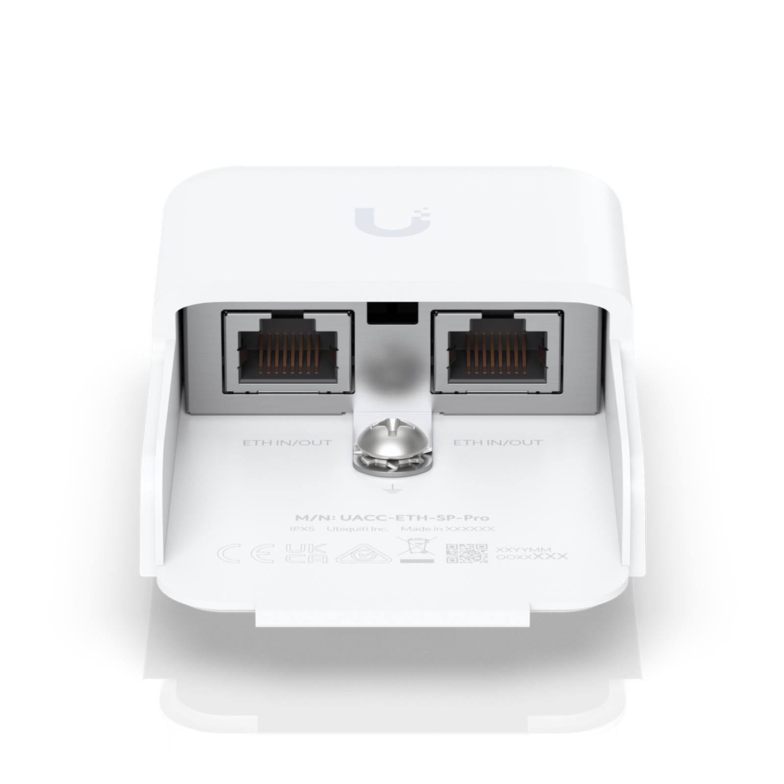 Ubiquiti UACC-ETH-SP-Pro to zabezpieczenie przeciwprzepięciowe firmy Ubiquiti przeznaczone do urządzeń zewnętrznych. Zapewnia skuteczną ochronę urządzeń (w tym urządzeń zasilanych przez PoE) przy prędkościach połączenia do 10 Gb/s. Przekierowuje szkodliwe wyładowania elektrostatyczne i przepięcia bezpośrednio do urządzenia UACC-ETH-SP-Pro, zapewniając bezpieczne uziemienie. Twoje urządzenia sieciowe będą zawsze chronione.