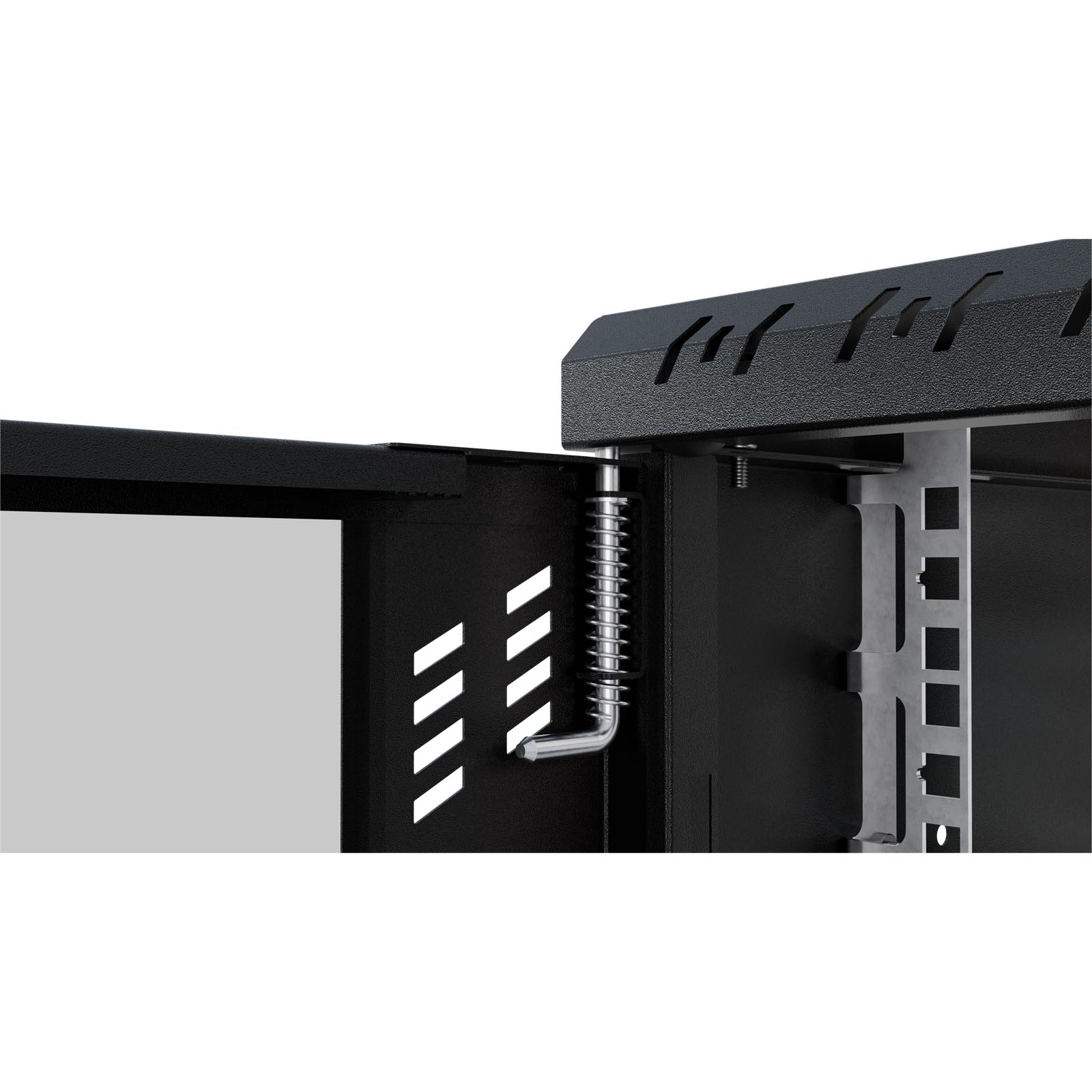 Szafę można łatwo przykręcić za pomocą kołków rozporowych (nie znajdują się w zestawie) dzięki otworom w tylnej części. Szafa umożliwia czteropunktowy montaż do ściany, co zwiększa jej stabilność. Drzwi można zamontować zarówno po prawej, jak i lewej stronie, a dzięki specjalnym zawiasom ze sprężyną ich montaż i demontaż jest niezwykle prosty. Szyny RACK można zamontować na trzech głębokościach, co pozwala na swobodne dopasowanie do urządzeń wewnątrz. W górnej i dolnej części znajdują się miejsca na wentylatory 120x120 mm (rozstaw otworów 105x105 mm), co zapewnia odpowiednie chłodzenie urządzeń. Dodatkowo, wyłamywane przepusty kablowe 50x80 mm (3 sztuki w górnej i 3 sztuki w dolnej części) ułatwiają zarządzanie okablowaniem. Szafa jest wyposażona w perforacje od frontu i po bokach, co jest kluczowe dla odprowadzania ciepła.