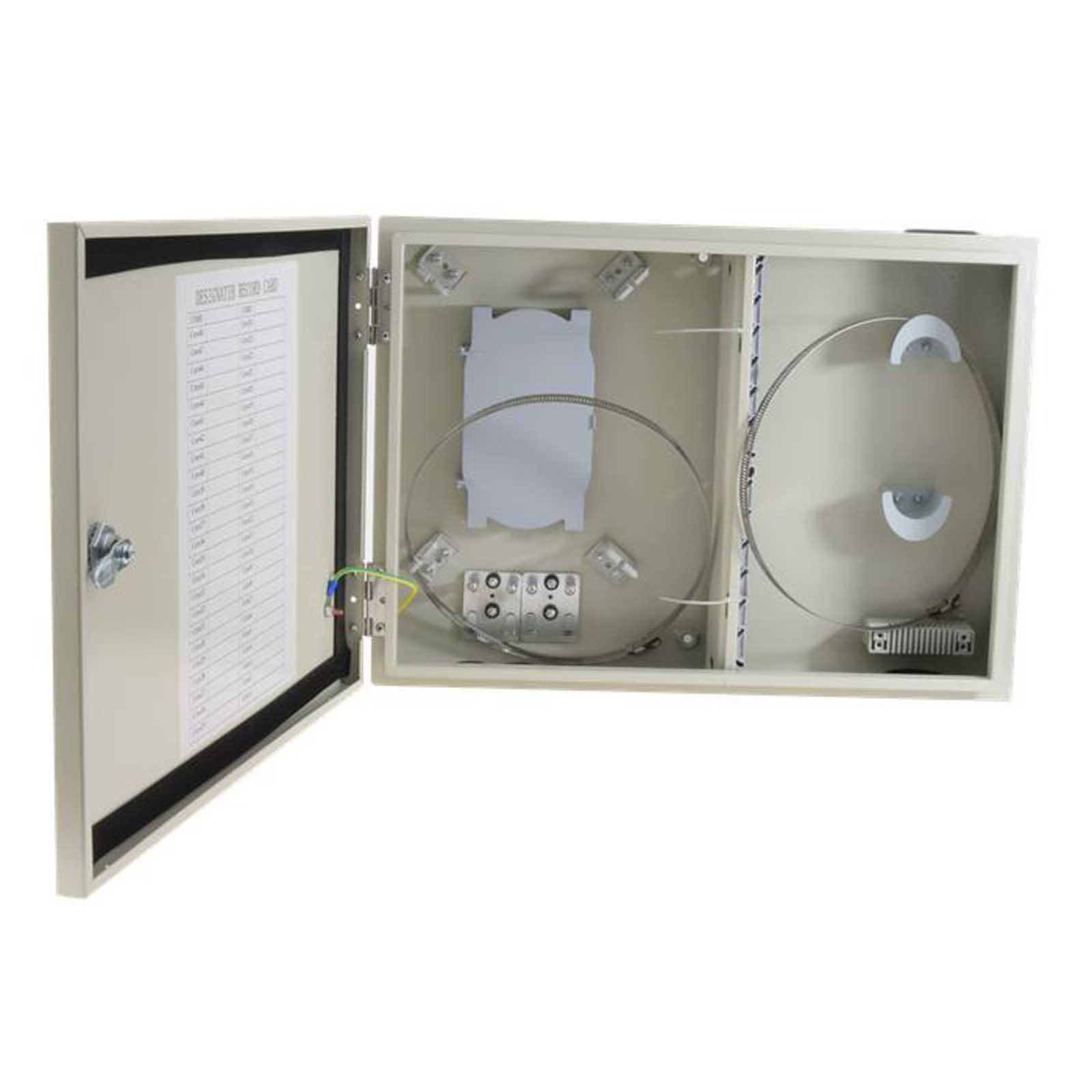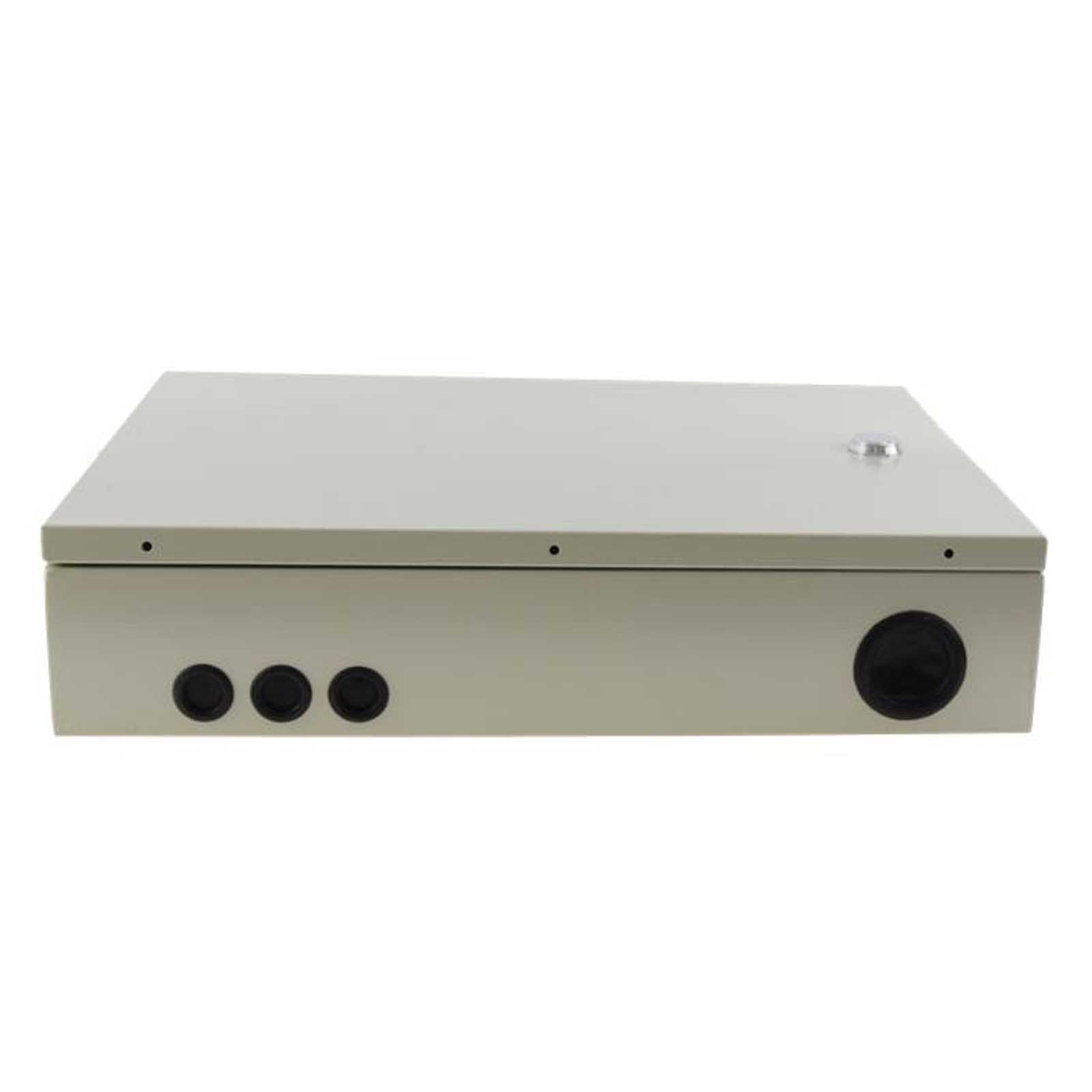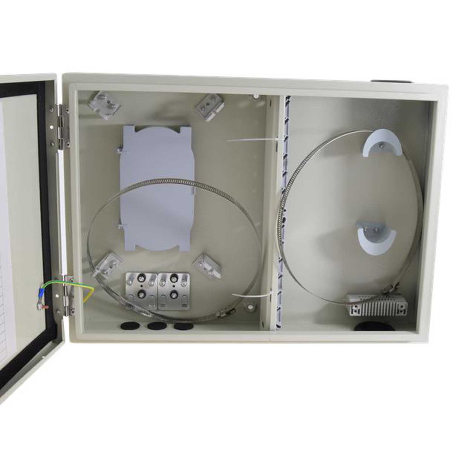 WyposażenieWyposażona jest w 5 otworów na przewody magistralne i dystrybucyjne z gumowymi zaślepkami i możliwośćią użycia dławików kablowych. Wnętrzne skrzynki zaopatrzone jest w 48 modułowych portów na adaptery światłowodowe typu SC/SC, SC/APC, SC/UPC simplex, lub LC duplex.