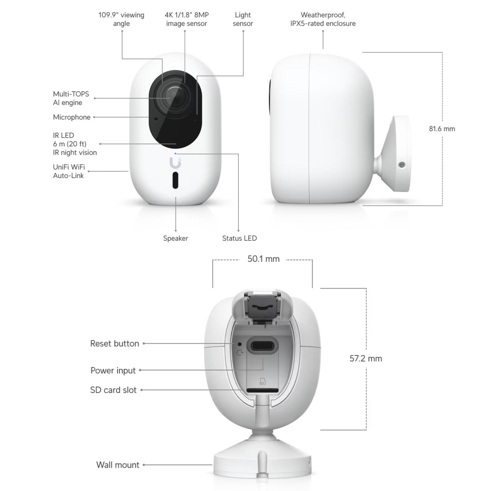 Kamera Ubiquiti UniFi Protect G6 Instant jest wyposażona w matrycę 8 MP (3840 x 2160 pikseli) przy 30 klatkach na sekundę, oświetlenie podczerwone do widzenia w nocy do 6 metrów, wbudowany mikrofon i głośnik. Jej stały obiektyw zapewnia pole widzenia 109,9°. Kamera ma solidną i kompaktową obudowę z poliwęglanu o odporności na wandalizm IK04 i wodoodporności IPX5. Łączy się z siecią za pośrednictwem dwuzakresowego WiFi obsługującego standardy 802.11a/b/g/n/ac i jest zasilana kablem USB-C (5 V/2 A) o maksymalnym poborze mocy 7 W.
