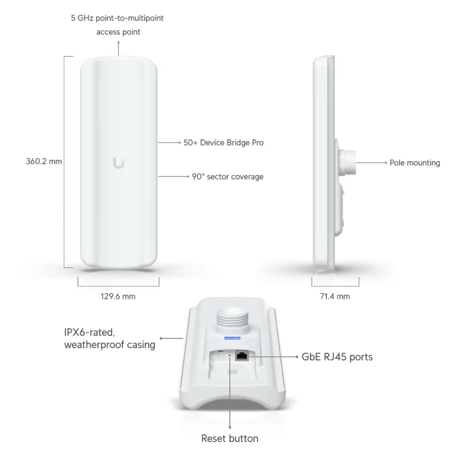 Ubiquiti Device Bridge Pro Sector to punkt dostępowy PtMP WiFi 5 z rodziny urządzeń UniFi. Działa w paśmie 5 GHz z maksymalną szybkością modulacji 400 Mb/s. Urządzenie jest wyposażone w antenę sektorową 90° o zysku 17 dBi i może połączyć się z ponad 40 urządzeniami klienckimi. Port Gigabit Ethernet służy do podłączenia do sieci i obsługuje wejście PoE o zakresie napięcia 42,5–57 V DC. Urządzenie ma maksymalny pobór mocy 6 W.