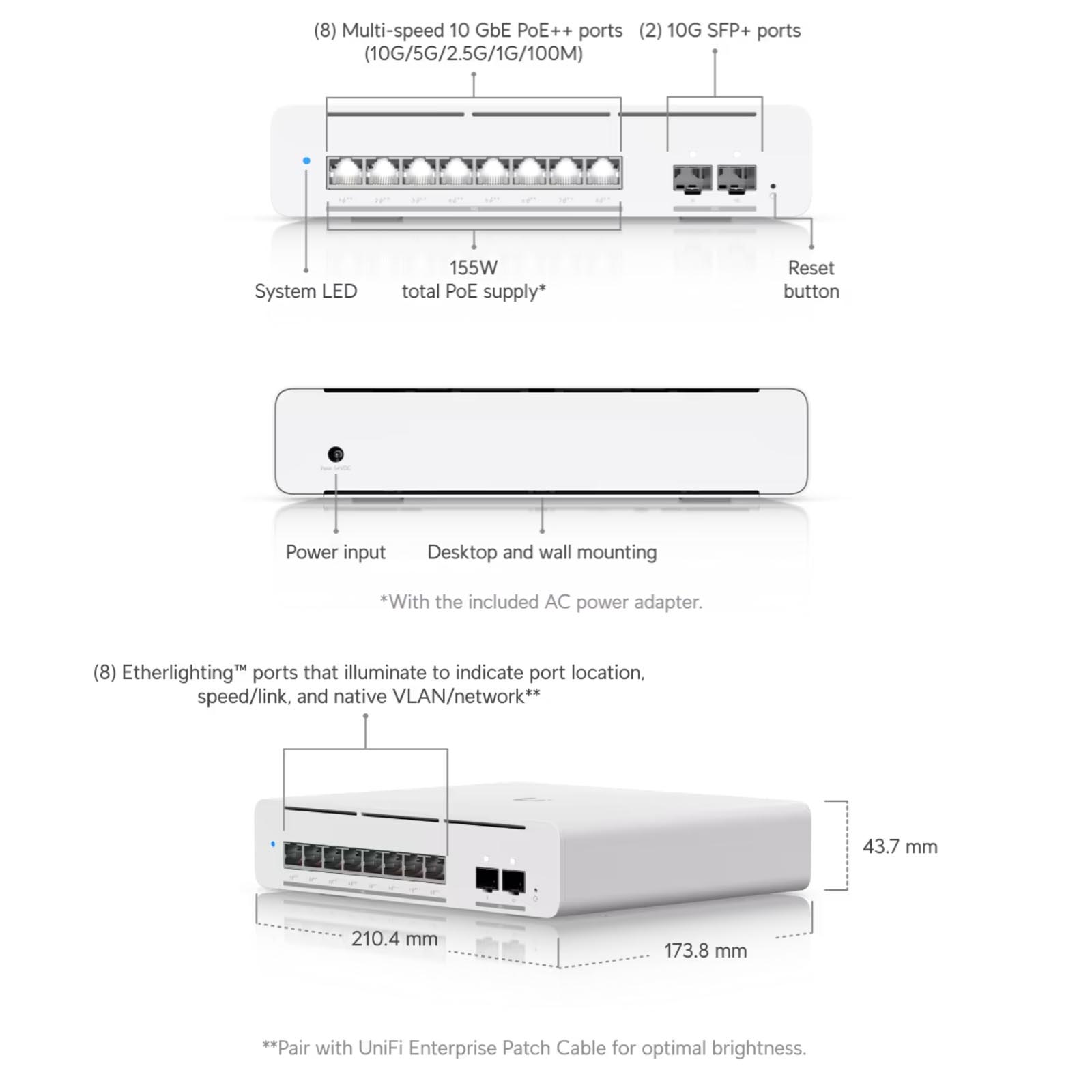- 8x portów 10G Gigabit Ethernet PoE z obsługą 802.3af/at/bt PoE++ (60 W/port)