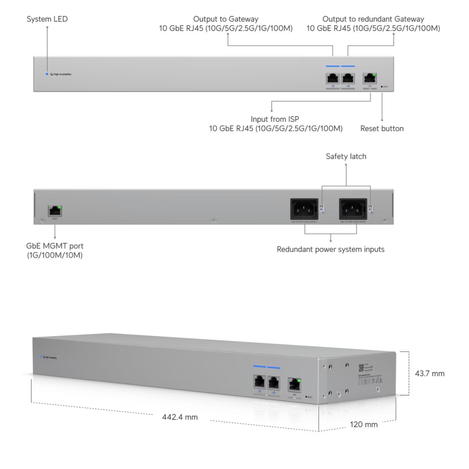 Ubiquiti USW-WAN-RJ45 to 10-gigabitowy przełącznik WAN przeznaczony do sieci o wysokiej dostępności. Łączy połączenia dwóch bram UniFi Gateway w trybie Shadow Mode w jedno wyjście w kierunku dostawcy usług internetowych, zapewniając redundancję w przypadku awarii jednego z nich. Jeśli chcesz korzystać zarówno z głównego, jak i zapasowego łącza uplink, wymagana jest para przełączników USW-WAN-RJ45.