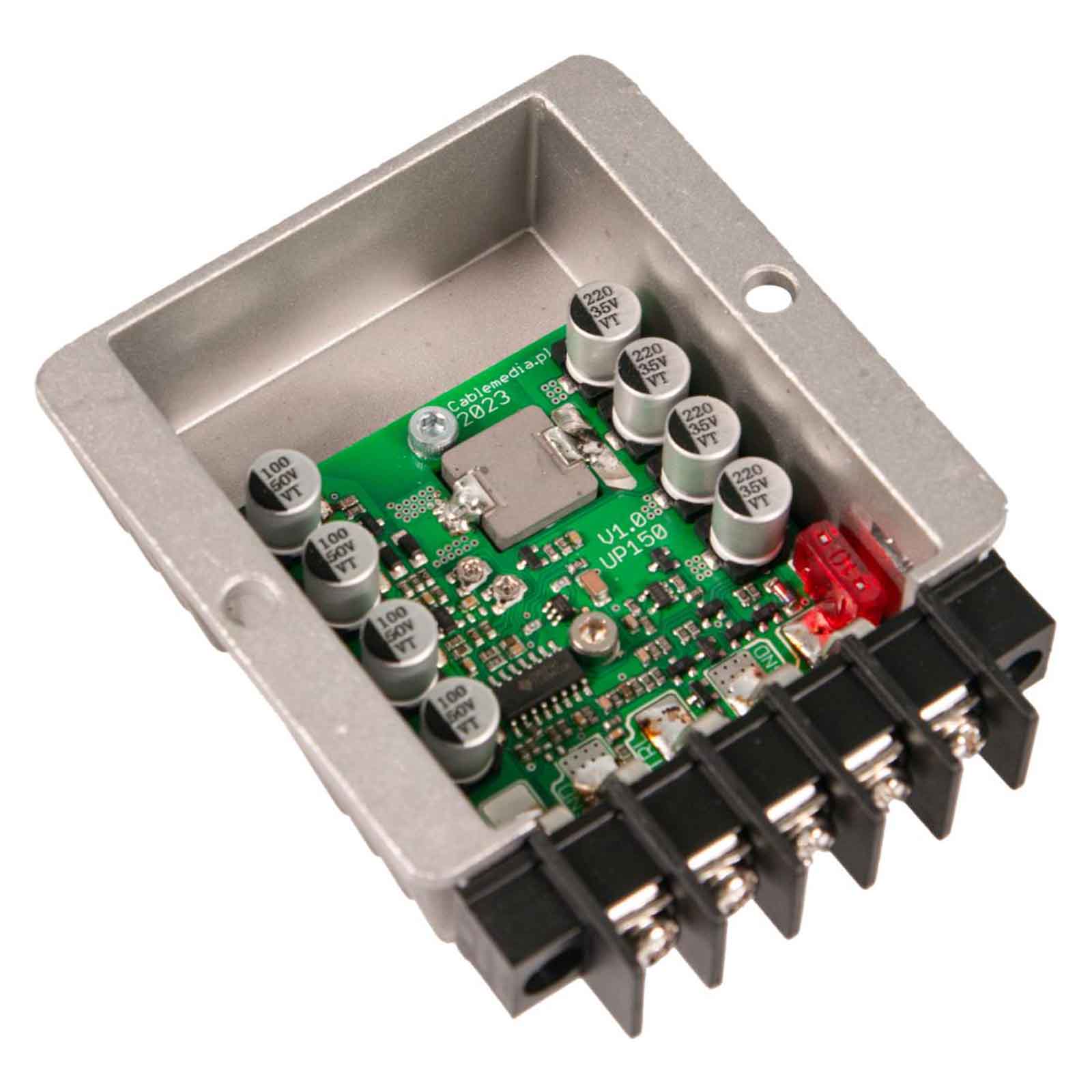 Przetwornica podnosząca napięcie Cablemedia UP-150-24/48 podnosi napięcie z 24 V DC na 48 V DC. Maksymalna moc wyjściowa wynosi 150 W, prąd 0-3 A. Produkt został zamknięty w niewielkiej, metalowej obudowie, po bokach posiada 2 otwory montażowe (rozstaw 65 mm).
