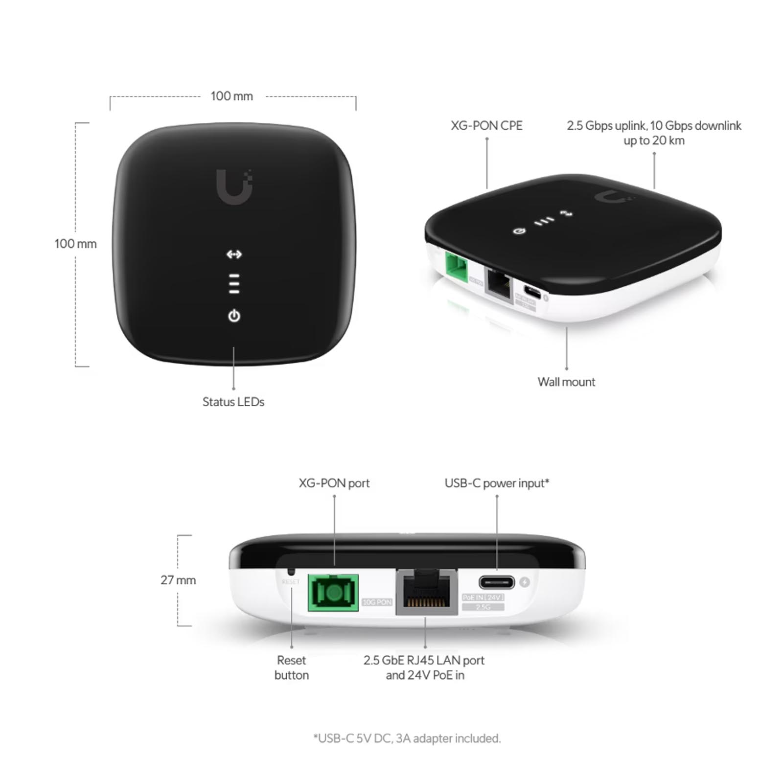 Ubiquiti UISP-FIBER-XG to jednostka CPE ONU przeznaczona do rozwiązań XGS-PON/XG-PON. Urządzenie służy do konwersji optycznego GPON na metalową sieć LAN i obsługuje wyłącznie tryb mostkowy, a nie tryb routera. Do połączenia z siecią XGS-PON/XG-PON wykorzystuje 1x złącze SC APC i maksymalną prędkością 9,95 Gb/s downstream i 2,44 Gb/s upstream. Moc nadawania wynosi od 2 do 7 dBm, a czułość odbioru od -9 do -27 dBm. Do połączenia LAN służy port LAN 2,5G z obsługą PoE-In 24 V DC. Urządzenie może być również zasilane za pomocą adaptera USB-C 5 V/3 A.