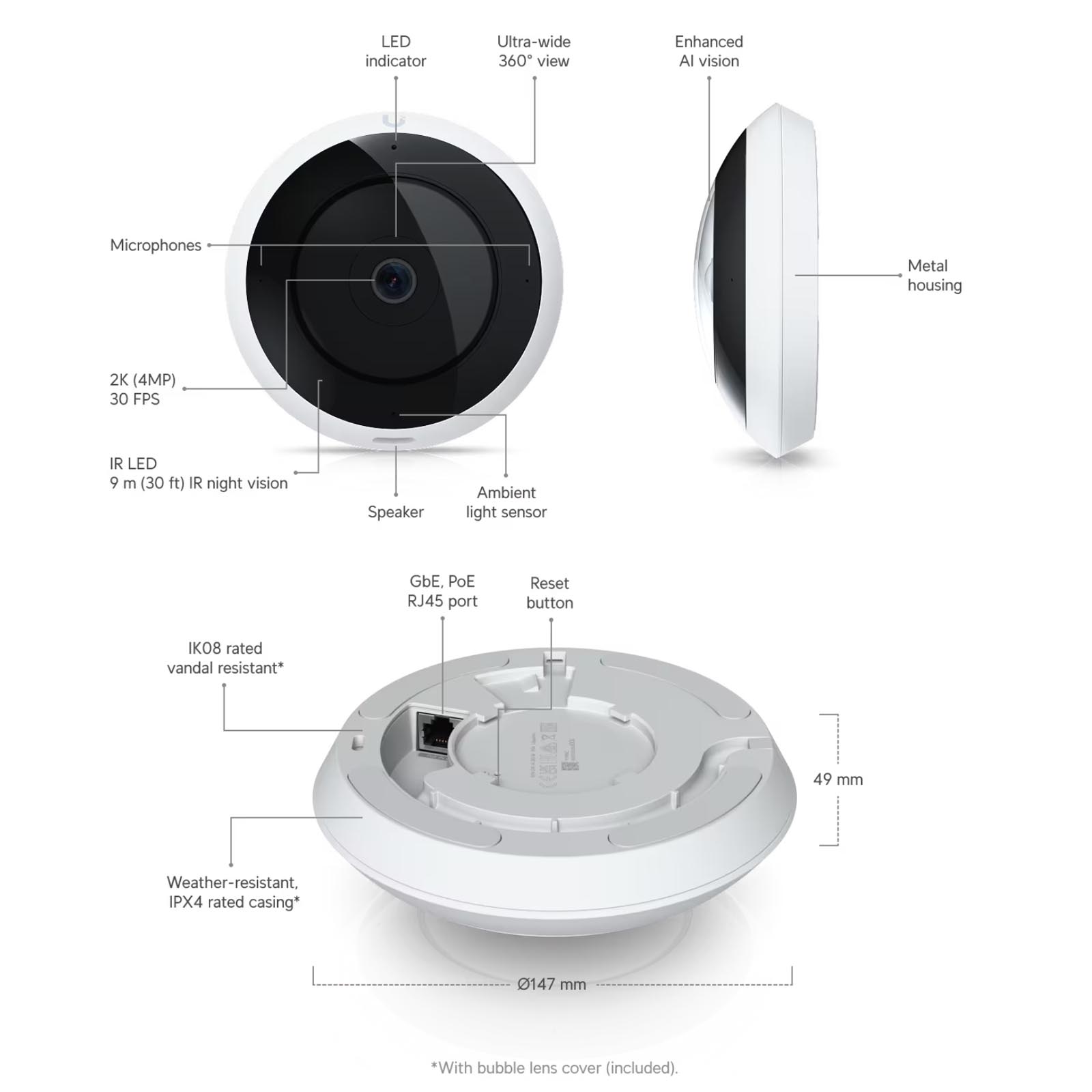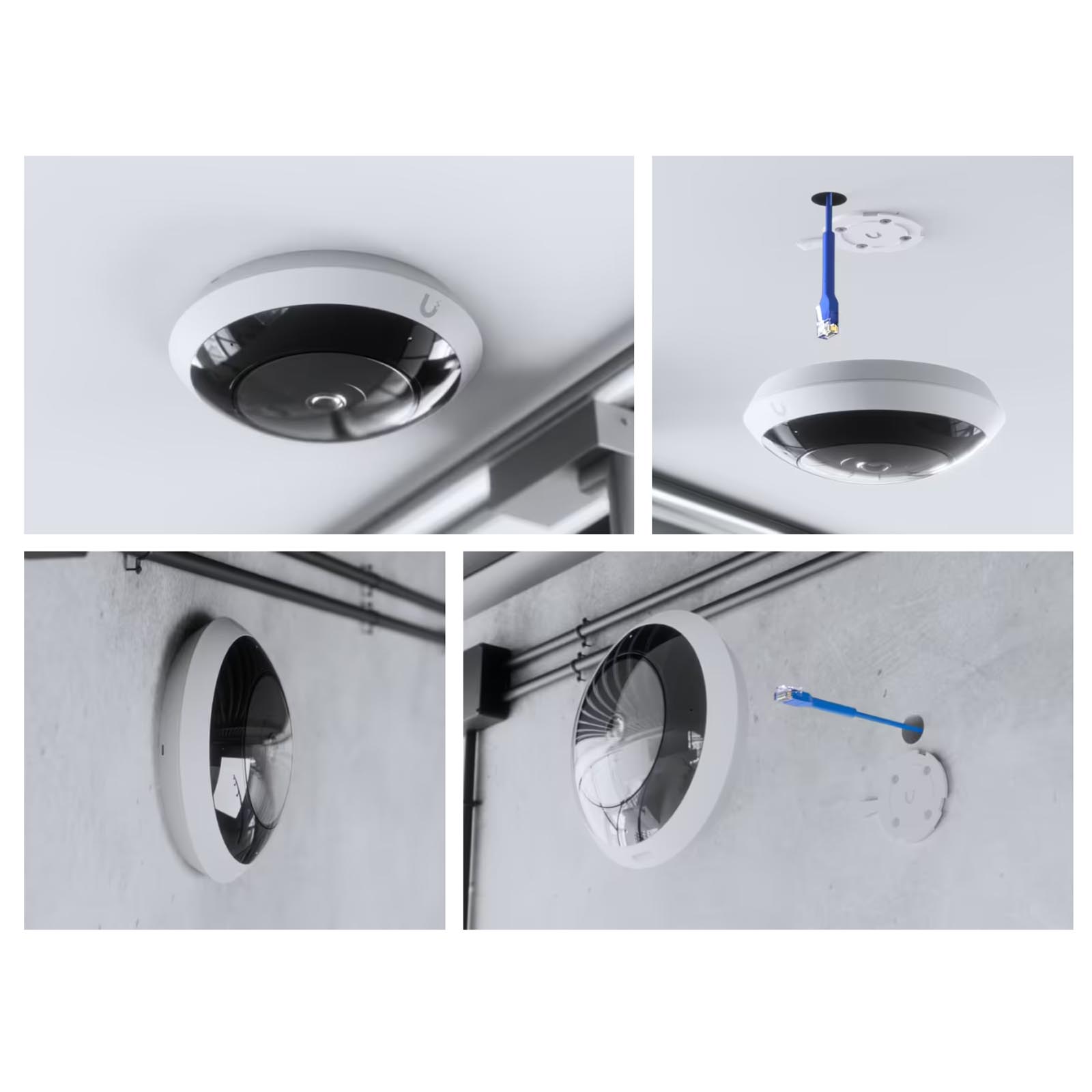 Kamera UVC-AI-360 wyposażona jest w matrycę CMOS 5 MP i ultraszerokokątny obiektyw typu "rybie oko" 360° (Fish Eye). Kamera Ubiquiti AI 360 może szybko wykryć drobne szczegóły w swoim rozległym obszarze pokrycia i uchwycić je z nieskazitelną wyrazistością. Kamerę można łatwo zamontować na ścianie lub suficie dzięki dołączonemu zestawowi montażowemu.