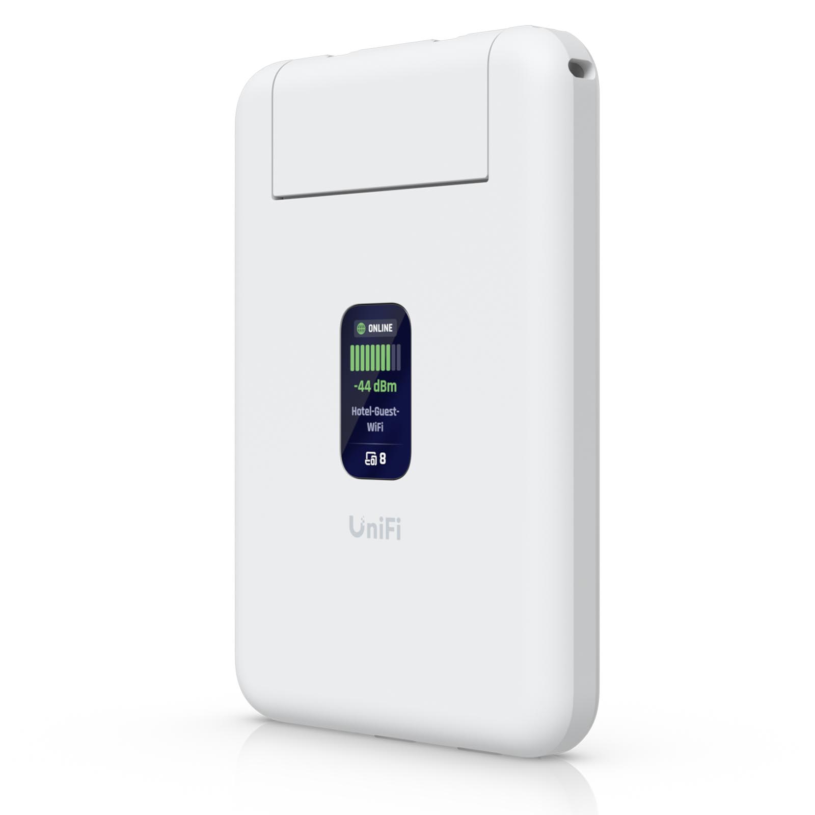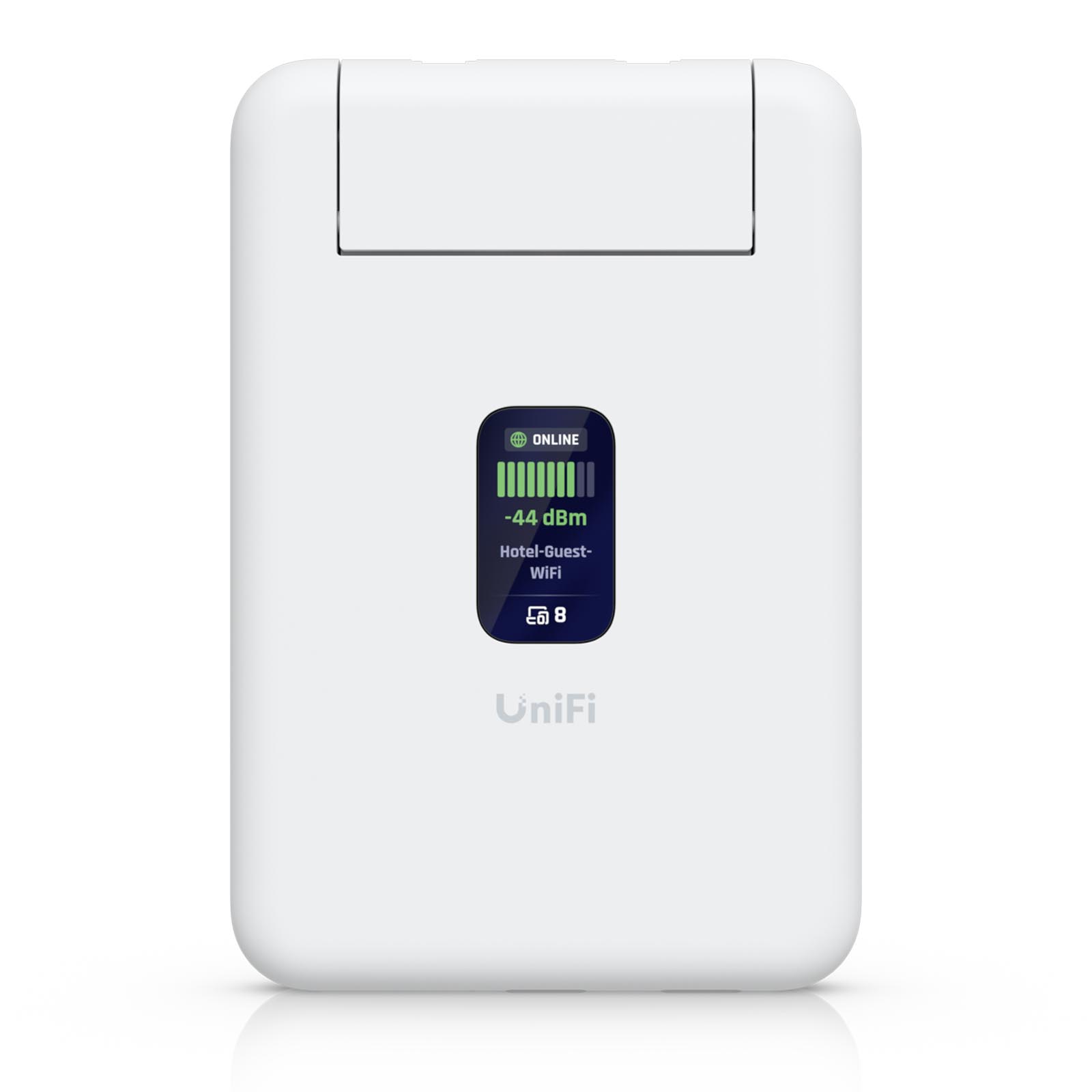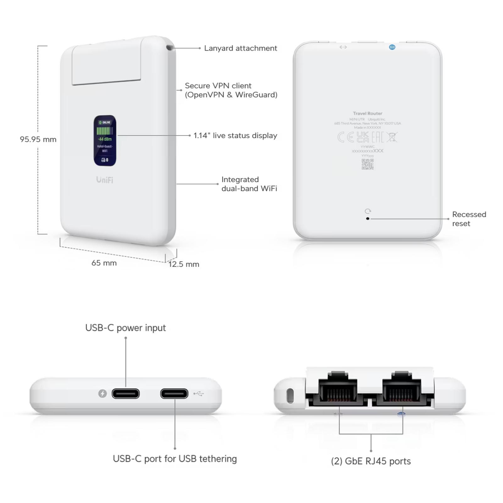 Router podróżny Ubiquiti UniFi UTR to ultrakompaktowy, dwupasmowy router podróżny Wi-Fi 5, działający jednocześnie w pasmach 2,4 GHz i 5 GHz, zapewniając maksymalną przepustowość do 1,17 Gb/s. Wyposażony jest w 2x porty Gigabit Ethernet i intuicyjny wyświetlacz. Router umożliwia udostępnianie danych mobilnych ze smartfona lub przekształcanie publicznej sieci Wi-Fi w sieć prywatną. Dzięki funkcji Teleport można łatwo utworzyć bezpieczny tunel VPN do swojej sieci UniFi z dowolnego miejsca.