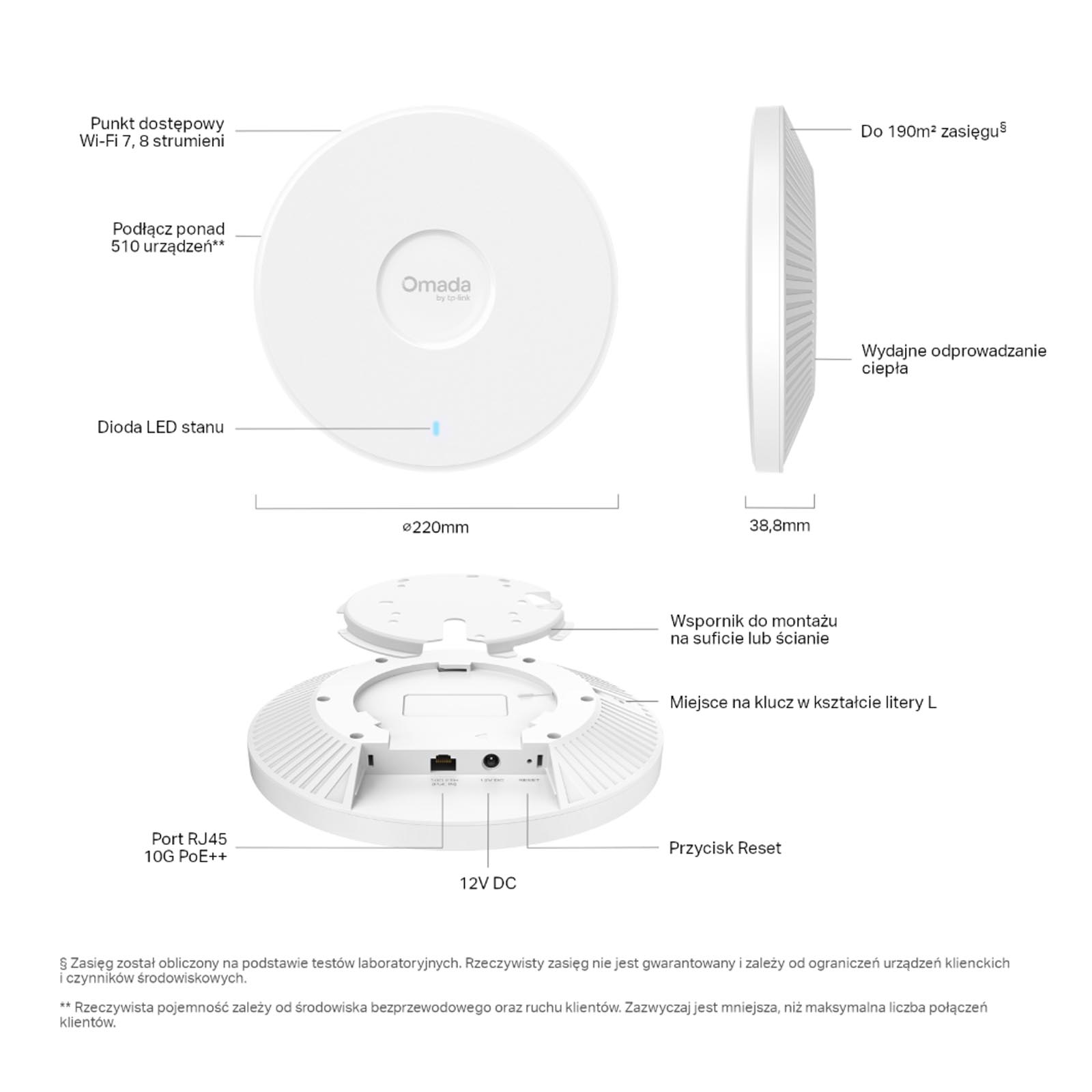 • Szerokość kanału 320 MHz‡ • MLO‡ • 4K-QAM‡ • Multi-RU‡ • Płynny roaming(802.11k/v/r) • MU-MIMO‡ • Mesh△ • Kolorowanie BSS‡ • OFDMA‡ • Równoważenie obciążenia pasma • Sterowanie pasmem • Beamforming • Airtime Fairness • Multi SSID:24 (8 na każde pasmo) • Harmonogram sieci bezprzewodowej • Harmonogram restartów • QoS(WMM) • Rate Limit • Statyczny/Dynamiczny adres IP • RADIUS Accounting • Uwierzytelnianie MAC |