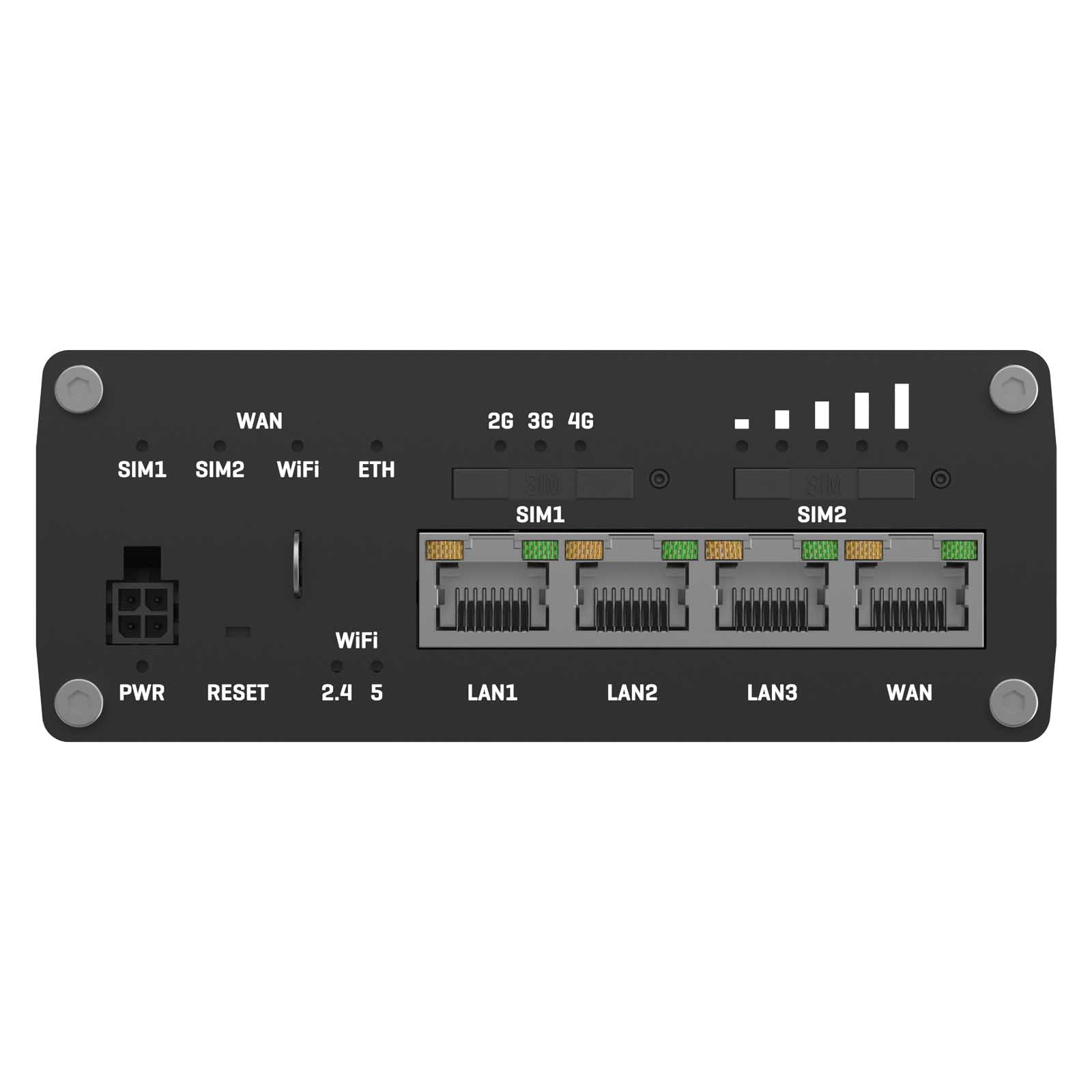 - Status LEDs: 4 x WAN type LEDs, 2 x Mobile connection type, 5 x Mobile connection strength, 8 x LAN status, 1 x Power, 2 x 2.4G and 5G Wi-Fi