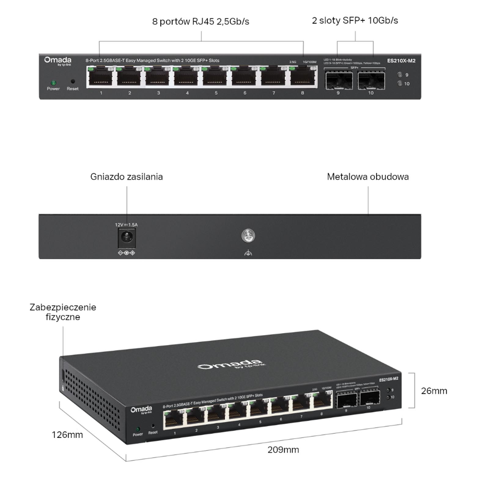• 8 portów RJ45 2,5 Gb/s • 2 slotów SFP+ 10 Gb/s • Automatyczna negocjacja / Automatyczne MDI/MDIX |