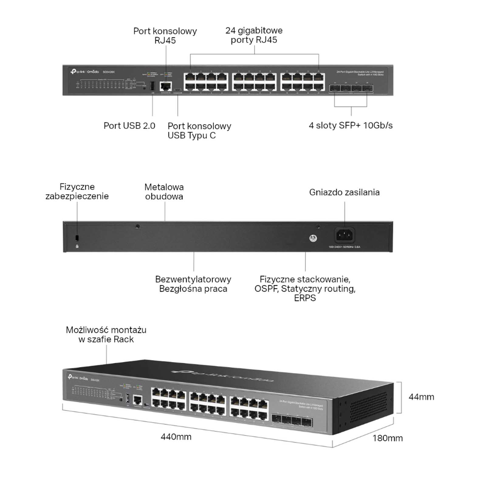 • 24 porty RJ45 10/100/1000 Mb/s • 4 sloty SFP+ 1/10 Gb/s* • 1 port USB 2.0 • 1 port konsolowy RJ45 • 1 port konsolowy USB Typu C |