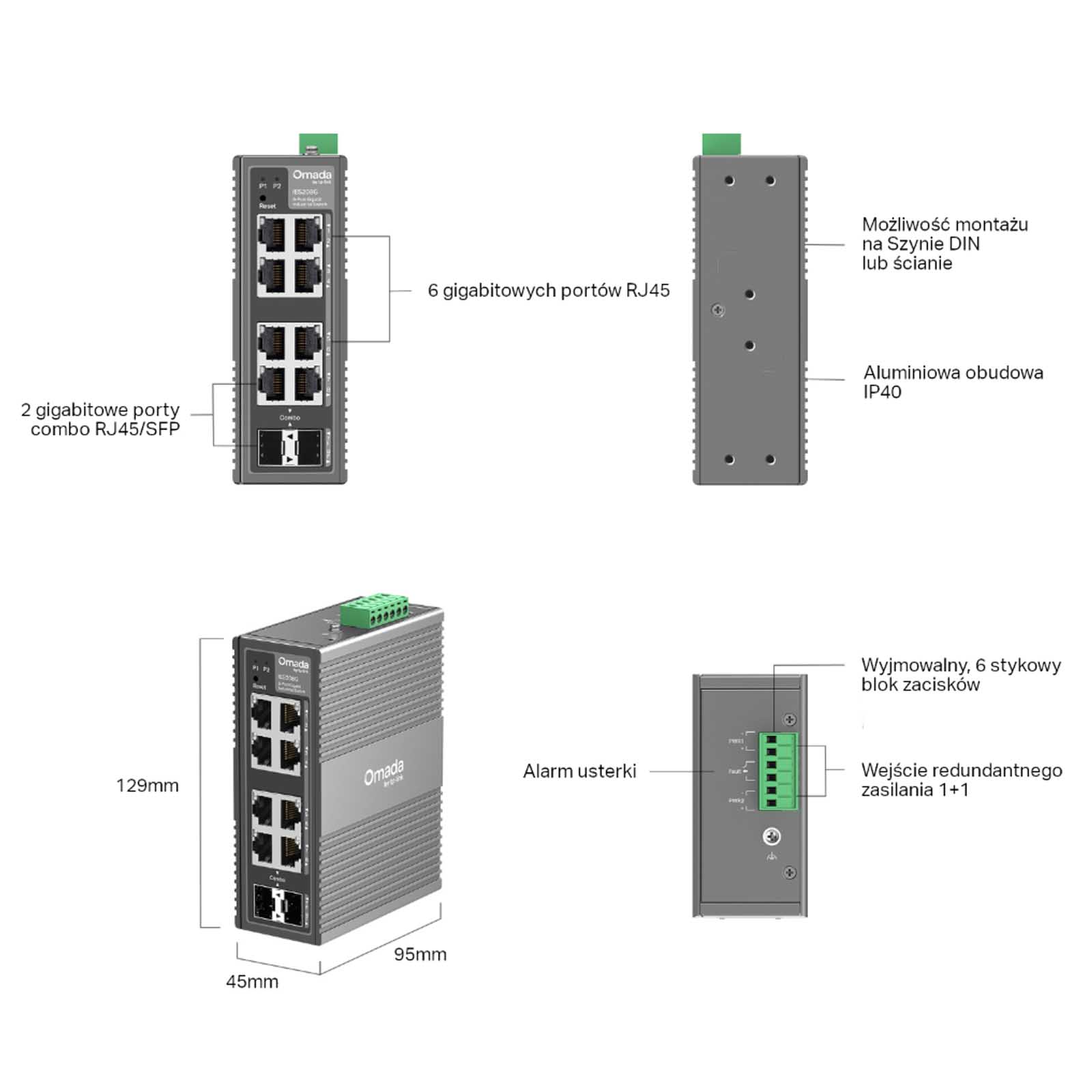 • 6 portów RJ45 10/100/1000 Mb/s • 2 gigabitowe porty combo SFP/RJ45 • Automatyczna negocjacja / Automatyczne MDI/MDIX |
