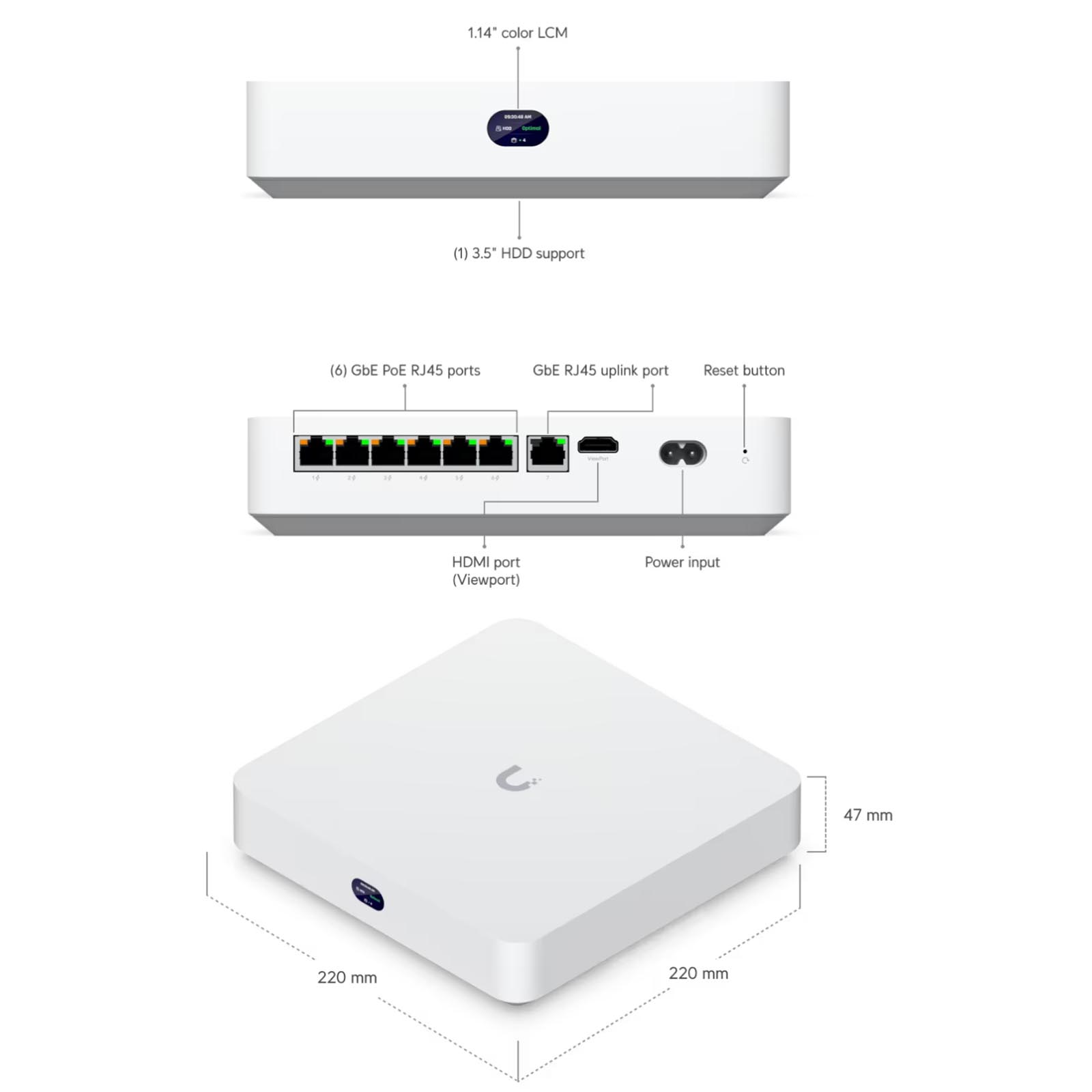 1x port uplinkowy 1G Ethernet 6x portów 1G Ethernet z wyjściem PoE 1x port HDMI (viewport)