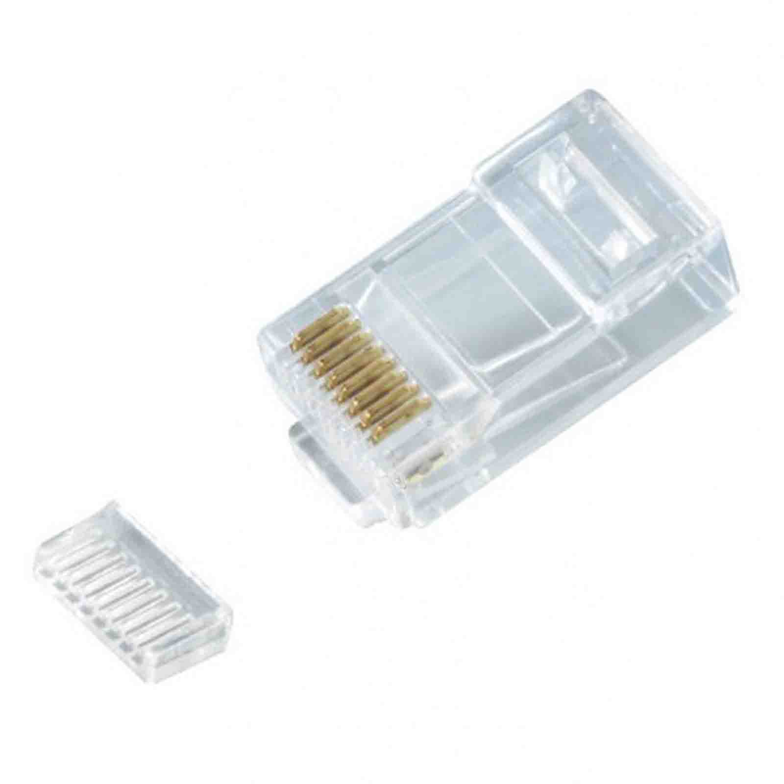Wtyk RJ45 (8p8c) 2-częściowy na drut UTP kategorii 6 to najbardziej popularny wtyk sieci LAN z ośmioma stykami, używany zazwyczaj do zakończenia przewodów łączących sprzęt sieciowy. Używany np. do połączenia komputera ze switchem lub routerem. Każdy pin pokryty warstwą czystego złota. Wersja na przewody typu drut.