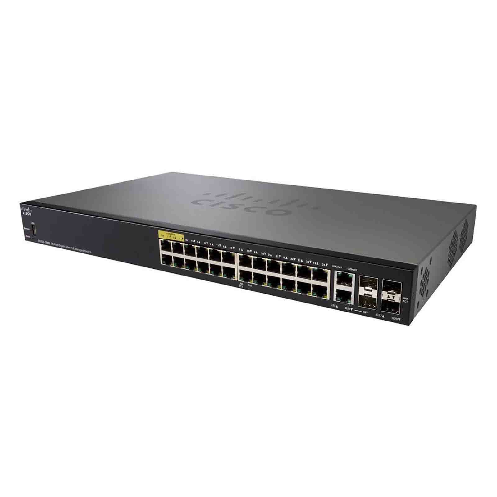 Cisco SG350-28MP (SG350-28MP-K9-EU) to zarządzalny 26 portowy Small Business Switch z 24x portami Gigabit Ethernet 10/100/1000 Mb/s PoE+, 2x slotami SFP i i 2x slotami SFP Combo. Porty PoE z budżetem mocy 382 W. Urządzenie jest objęte ograniczoną dożywotnia gwarancją producenta.