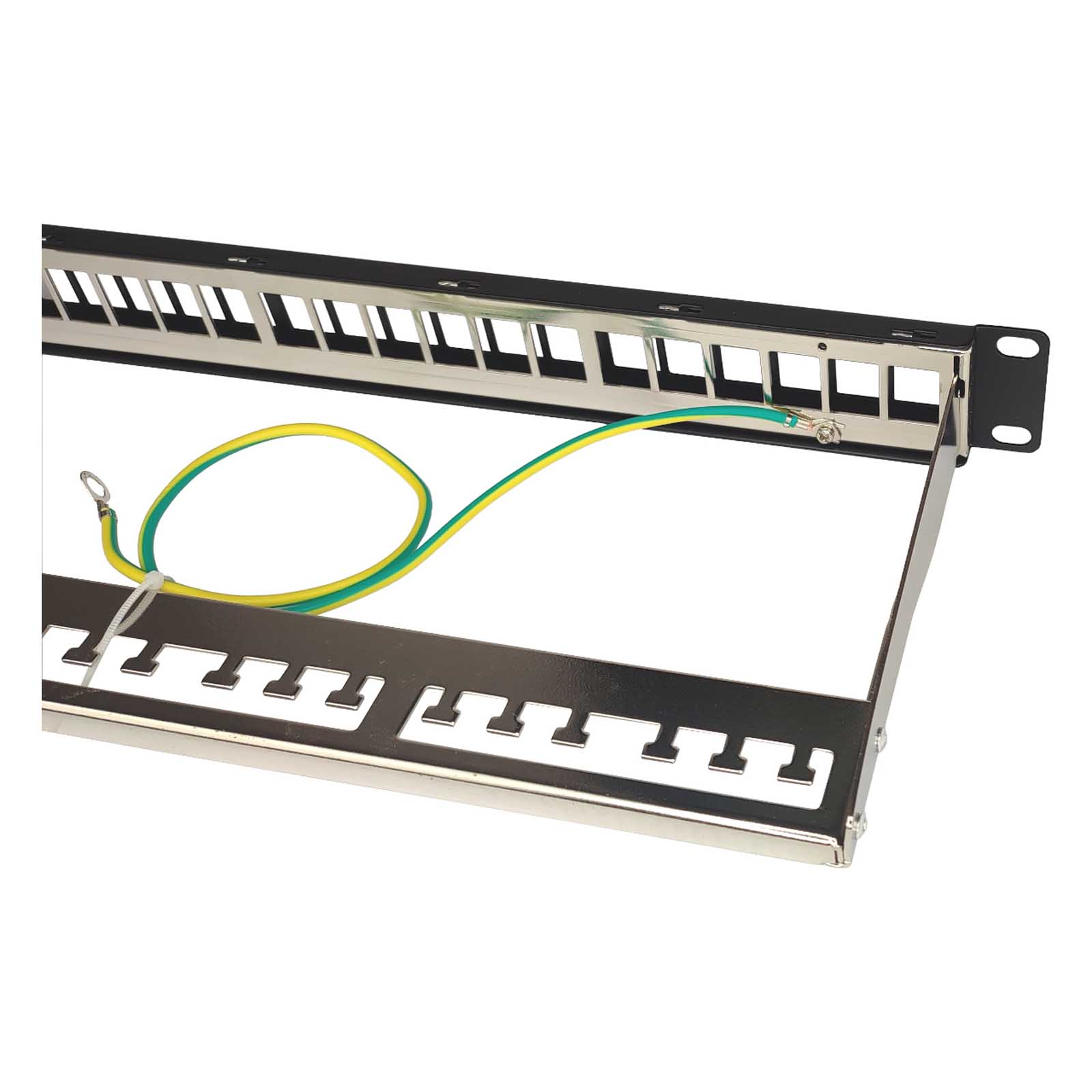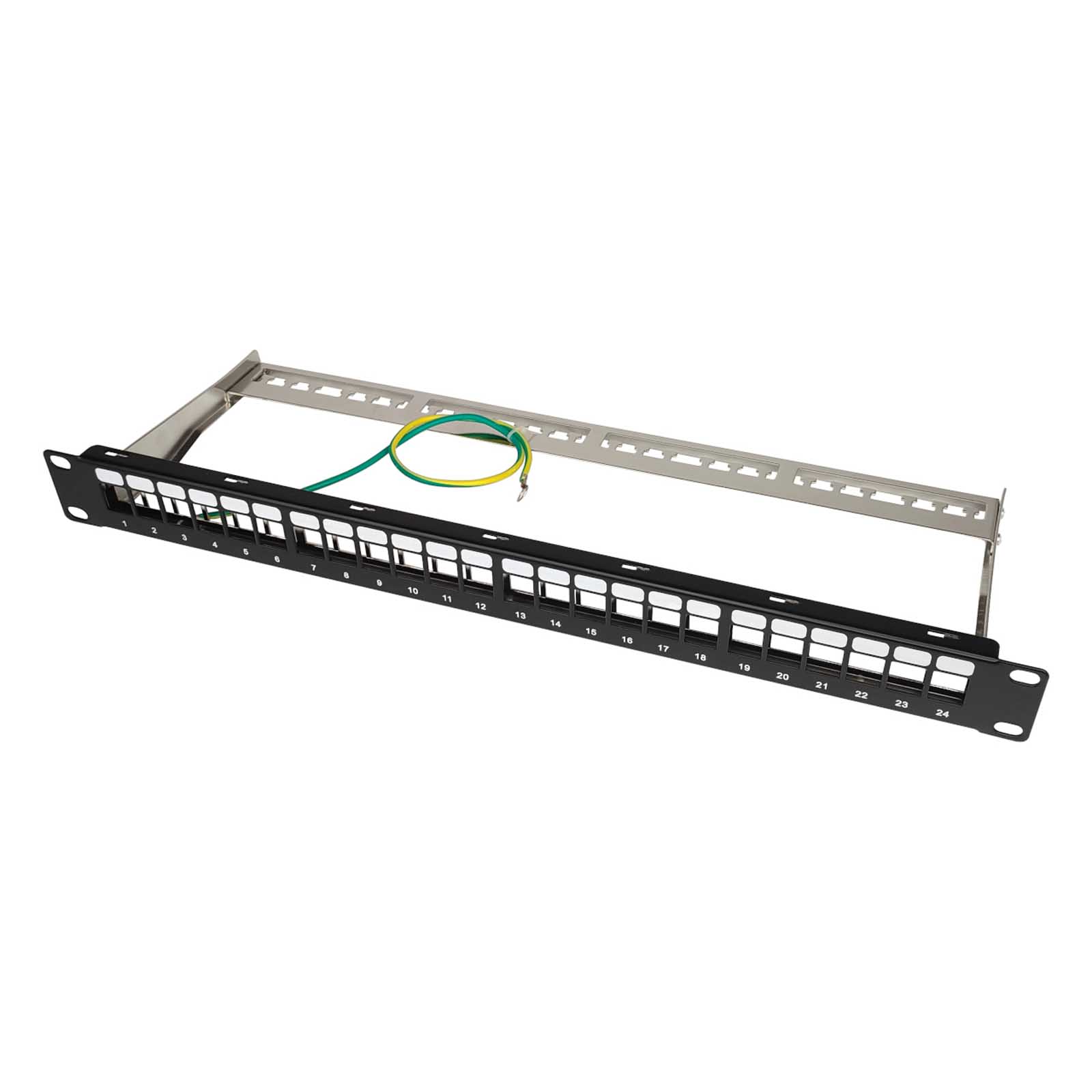 Patch panel 19" 24x RJ45, niewyposażony STP to 24 portowy uniwersalny panel krosowy zaprojektowany do instalacji w szafach rack 19". Wyposażony jest w 24 wolne sloty, w których mogą zostać zainstalowane moduły typu keystone ekranowane i nieekranowane w różnych konfiguracjach.