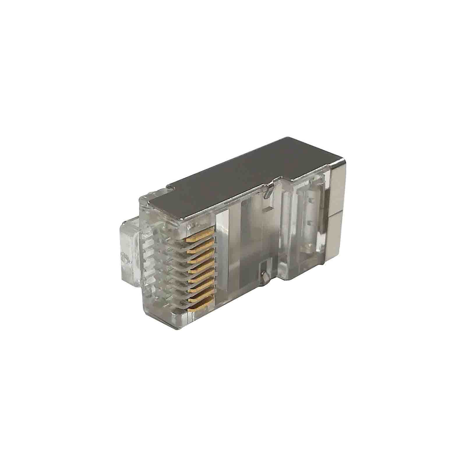 Wtyk RJ45 STP ekranowany z pozłacanymi pinami (drut) kat.6, przelotowy jest przeznaczony do zakańczania ekranowanych przewodów typu skrętka w instalacjach okablowania strukturalnego. Posiada 8 miejsc na styki i 8 styków.