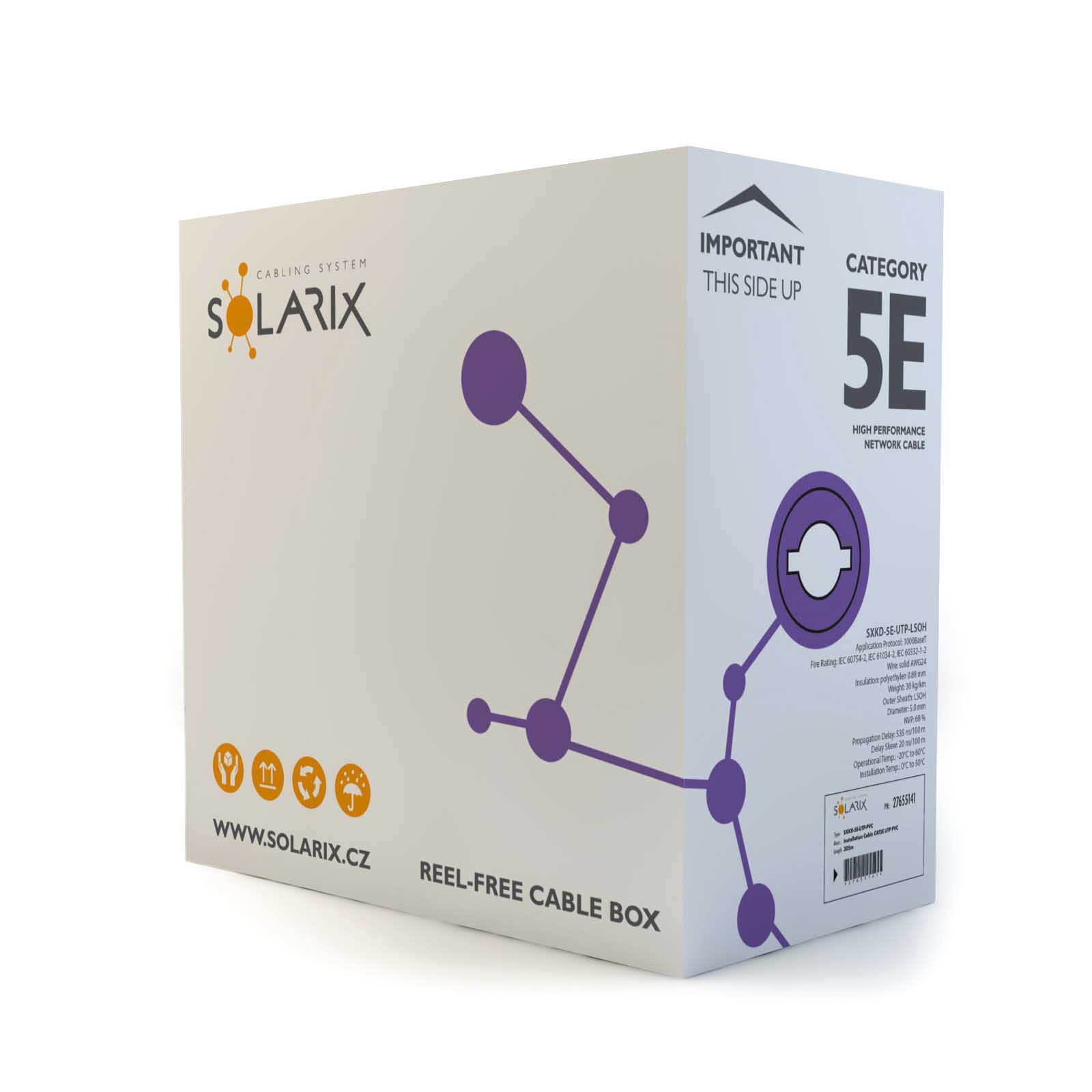 SXKD-5E-UTP-LSOH jest niezawodną częścią składową serii produktowej Solarix – kategoria 5E. Wspólnie z pozostałymi komponentami systemu okablowania strukturalnego Solarix stwarza rozwiązanie, które zapewnia długi czas użytkowania, maksymalną wydajność i bezproblemowy ruch sieci komputerowej. Kable instalacyjne Solarix – kategoria 5E są przeznaczone dla przewodów horyzontalnych i są oferowane w wersji ekranowej i nieekranowanej z różnym typem osłony - tj. PVC (klasa reakcji na ogień Eca), LSOH (klasa reakcji na ogień Dca s1 d2 a1) lub UV stabilne PE (klasa reakcji na ogień Fca).