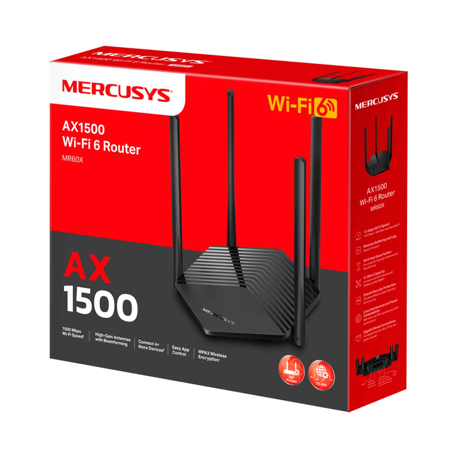 Mercusys MR60X to bezprzewodowy router gigabitowy WiFi 6 AX1500 pracujący w dwóch pasmach jednocześnie. Wyposażony jest w 3x gigabitowe porty Ethernet (1x WAN, 2x LAN). Transmituje sieć WiFi z prędkością do 1501 Mb/s (300Mb/s dla sieci 2,4GHz i 1201Mb/s dla 5GHz).
